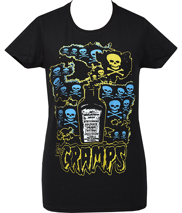 The Cramps Strychnine women’s t-shirt with skull and poison bottle artwork. A psychobilly punk band tee with cult horror vibes.