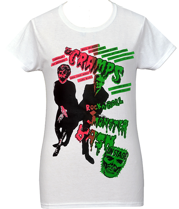 A fitted women’s The Cramps Monster Bash T-shirt with bright pink and green psychobilly artwork and classic punk attitude.