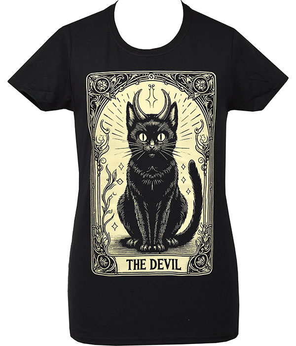 Unleash your dark side with “The Devil” women’s T-shirt, featuring a haunting black cat inspired by the tarot’s Devil card.