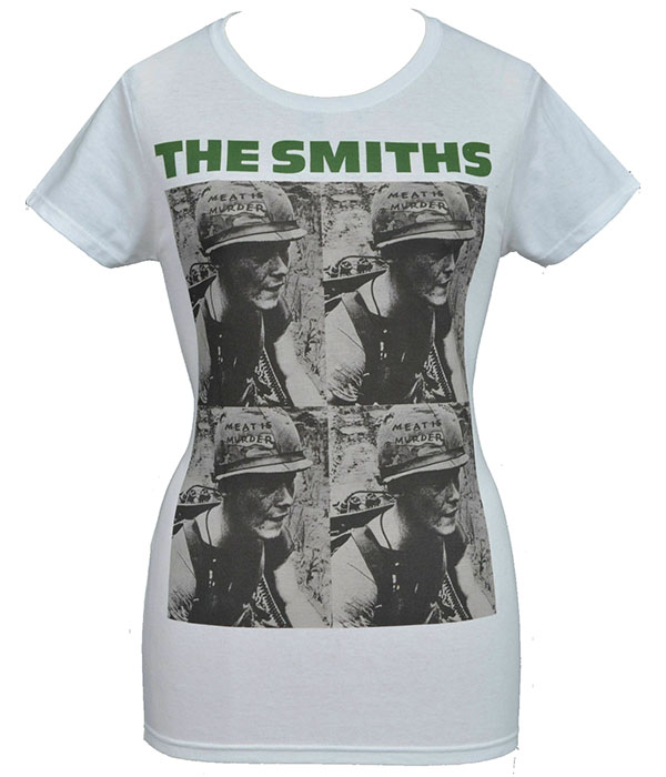 The Smiths Meat Is Murder women’s white t-shirt with iconic album artwork and green logo. Essential 80s indie band tee for true alternative fans.