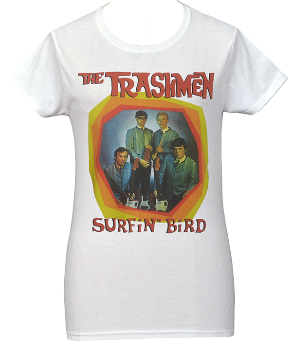 Women’s white The Trashmen “Surfin’ Bird” T-shirt inspired by classic garage rock and proto-punk.