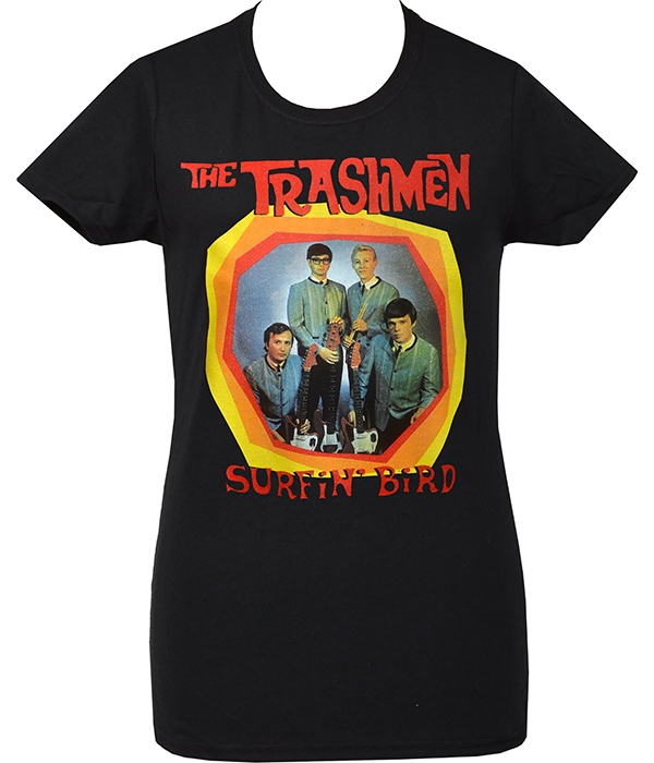 Women’s black The Trashmen “Surfin’ Bird” T-shirt inspired by classic garage rock and proto-punk.