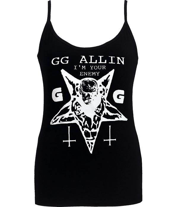 GG Allin “I’m Your Enemy” women’s black spaghetti-strap punk top with bold white print.