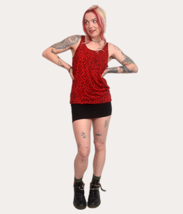 Leopard print has long been worn by punks, outsiders, and people who refuse to blend in. As a result, this red leopard tank pairs perfectly with mini skirts, ripped jeans, bondage trousers, or layered under a leather jacket. Wear it clean, wear it wrecked, or make it part of your regular uniform.