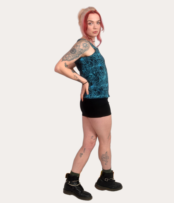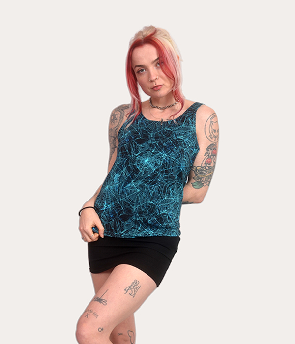 UK-made Spiderweb Tank Top with a bold blue web print. Punk-inspired, easy to wear, and built for gigs, streets, and everything after.
