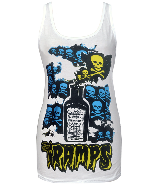 A psychobilly punk women’s tank top inspired by The Cramps, featuring a bold Strychnine bottle and skull artwork.